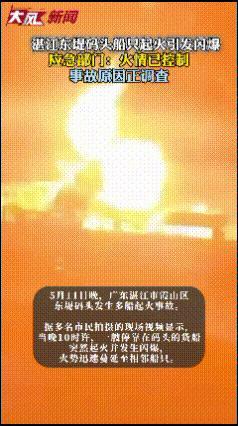 5月11日晚,广东湛江市霞山区东堤码头发生多船起火事故。据市民拍摄的现场视频显示,当晚10时许,一艘停靠在码头的货船突然起火并发生闪爆,火势迅速蔓延至相邻船只。