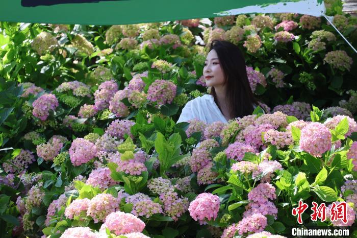 5月12日,贵州惠水,游客在绣球花海中拍照。刘美伶 摄