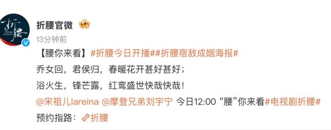 由宋祖儿和刘宇宁领衔主演的电视剧《折腰》今日10时突然通过微博宣布,中午12时正式开播:“乔女回,君侯归,春暖花开甚好甚好;浴火生,锋芒露,红鸾盛世快哉快哉!”