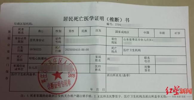 5月12日,台儿庄外卖站点负责人苗先生表示,目前此事已经在走法律程序。袁先生的妻子周女士介绍,袁先生今年47岁,已经跑了5年外卖。5月4日早上8点40左右,袁先生出门上班,出小区后又折返回来,最后倒在楼下。小区里的热心人帮忙拨打了120,但袁先生在医院抢救了一个小时后不幸去世。居民死亡医学证明书显示,袁先生因呼吸心跳骤停,在医院死亡。