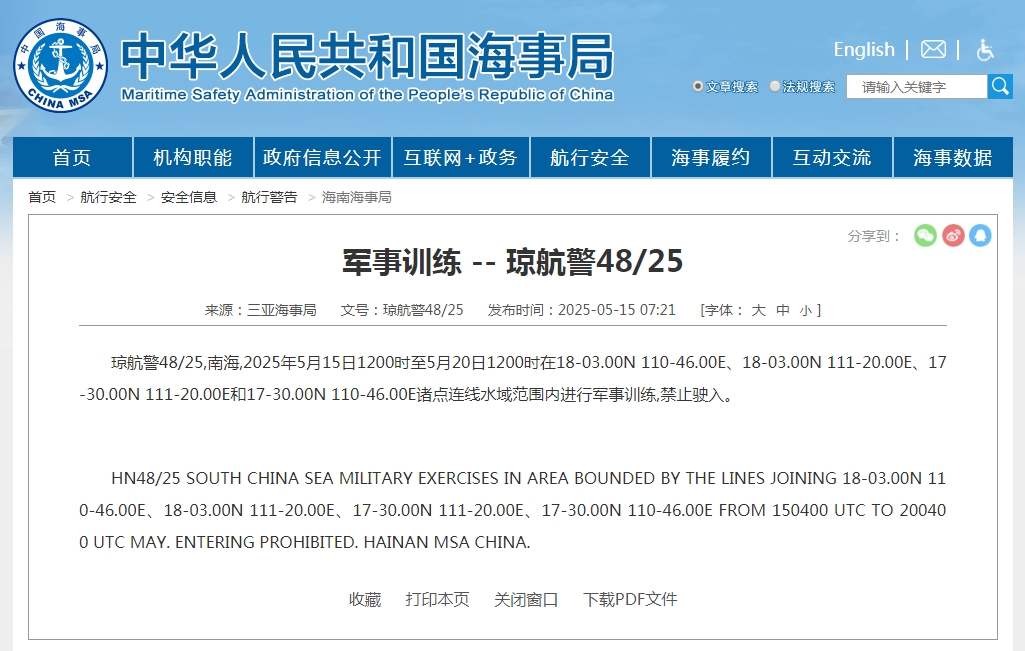 中新网5月15日电 据中国海事局网站消息,三沙海事局发布航行警告(琼航警48/25),5月15日12时至5月20日12时,南海部分海域进行军事训练,禁止驶入。