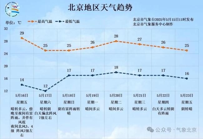 从5月16日至5月23日,白天最高气温在25℃~29℃之间,夜间最低气温在12℃~18℃之间。