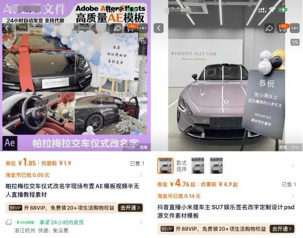 除了小米订单截图的源文件,前述商家一般还同时售卖帕拉梅拉交车仪式AE模版、机票截图、其他直播爆款素材等。