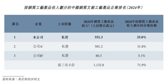 2013年公司创立,到2024年,成为中国铜质文创工艺品市场收入第一,市场份额35.0%。