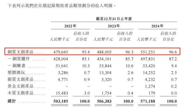 不过,最近两年,公司96%以上的收入,仍是由铜质产品贡献。其他品类中,塑胶潮玩收入规模最大,2024年也仅有1425.2万元,占公司总收入的2.5%;银质产品最近3年的收入维持在400万元左右;黄金文创产品2024年刚刚起步,当年收入仅有127.4万元。对于起步更早的木质文创,公司在2022年选择了退出,收入大幅下降。