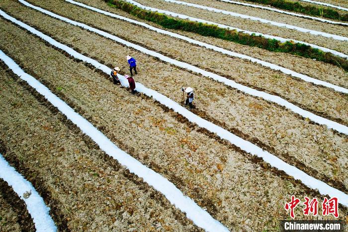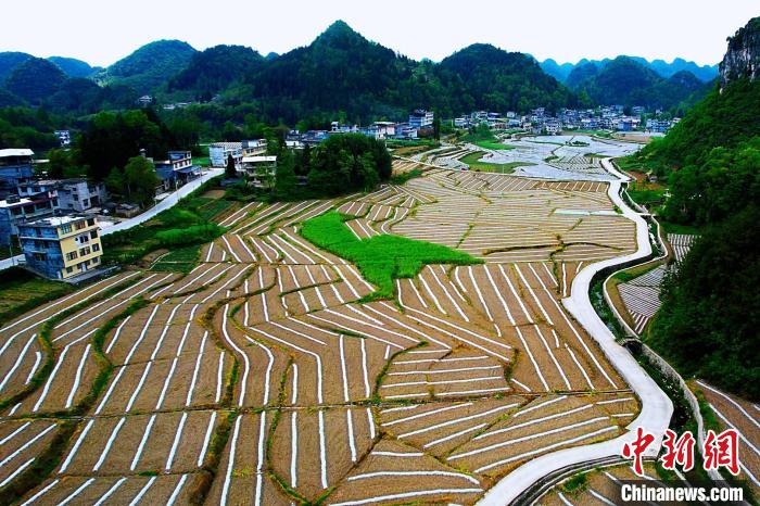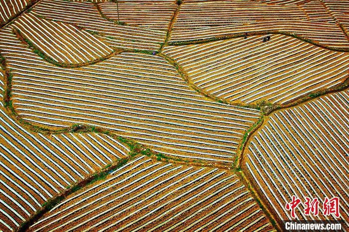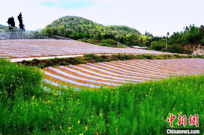 近日,在湖北省咸丰县坪坝营镇新场村,农户们利用晴好天气抓紧劳作,在田里覆膜,移栽烟叶、辣椒苗等种植物。农田与青山、民房、公路、沟渠相映,构成一幅美丽的初夏田园画卷。曾洁 摄