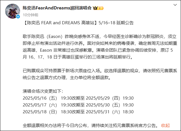 陈奕迅确诊新冠 演唱会延期 Eason遗憾发声!5月15日,陈奕迅Fear and Dreams巡回演唱会官方微博发布延期公告。歌手陈奕迅因突感身体不适,经医生诊断确诊为新冠肺炎,需立即停止所有演出活动并进行休养。面对突如其来的病毒侵袭,确定首周无法如期重返高雄,陈奕迅非常难过也深感歉意。演唱会团队已紧急协调后续安排,原定于5月16、17、18日在高雄巨蛋举行的三场演出将延期举行。