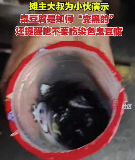 5月14日,广东广州。李先生在买臭豆腐时,问摊主为什么他的臭豆腐时黄色的,于是摊主现场给演示臭豆腐是如何“变黑的”。视频显示,大叔用调料加了点开水,水就变黑了。他还表示自己买了15年的臭豆腐,提醒小伙不要买染色臭豆腐吃。