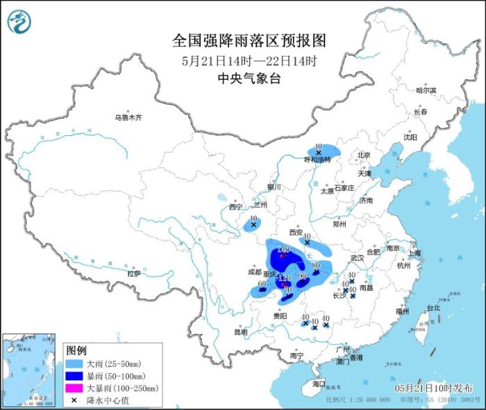 中新网5月21日电 据中央气象台网站,中央气象台5月21日10时继续发布暴雨蓝色预警:预计,5月21日14时至22日14时,甘肃南部、四川东部、重庆大部、贵州东北部、湖北西南部、湖南西北部以及江西西部、广西北部、内蒙古中部等地部分地区有大到暴雨,其中,四川盆地东北部、重庆西南部等地局地有大暴雨(100~140毫米)。上述部分地区伴有短时强降水(最大小时降雨量20~50毫米,局地可超过70毫米),局地有雷暴大风等强对流天气。