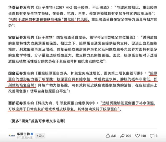 华熙生物在公开信中,引用了券商对玻尿酸、胶原蛋白之间差异的点评: