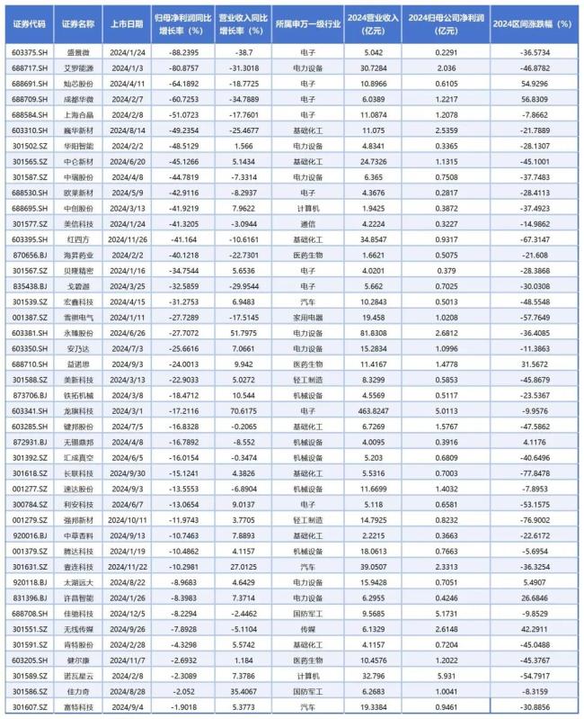 从刚刚披露完的2024年年报业绩表现看,100只2024年新股中出现归母净利润同比下降的有43家,占比43%。其中,盛景微、艾罗能源、灿芯股份、成都华微、上海合晶5家公司跌幅超过50%。