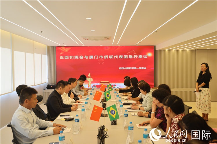 人民网里约热内卢5月20日电 (记者时元皓、陈海琪)当地时间5月20日,正在巴西里约热内卢访问的福建省厦门市侨联主席陈俊泳一行到访巴西中国和平统一促进会(以下简称“巴西和统会”)会馆,并与巴西和统会举行座谈。中国驻里约热内卢总领馆副总领事王尉育、巴西和统会会长张小春出席座谈会并致辞。