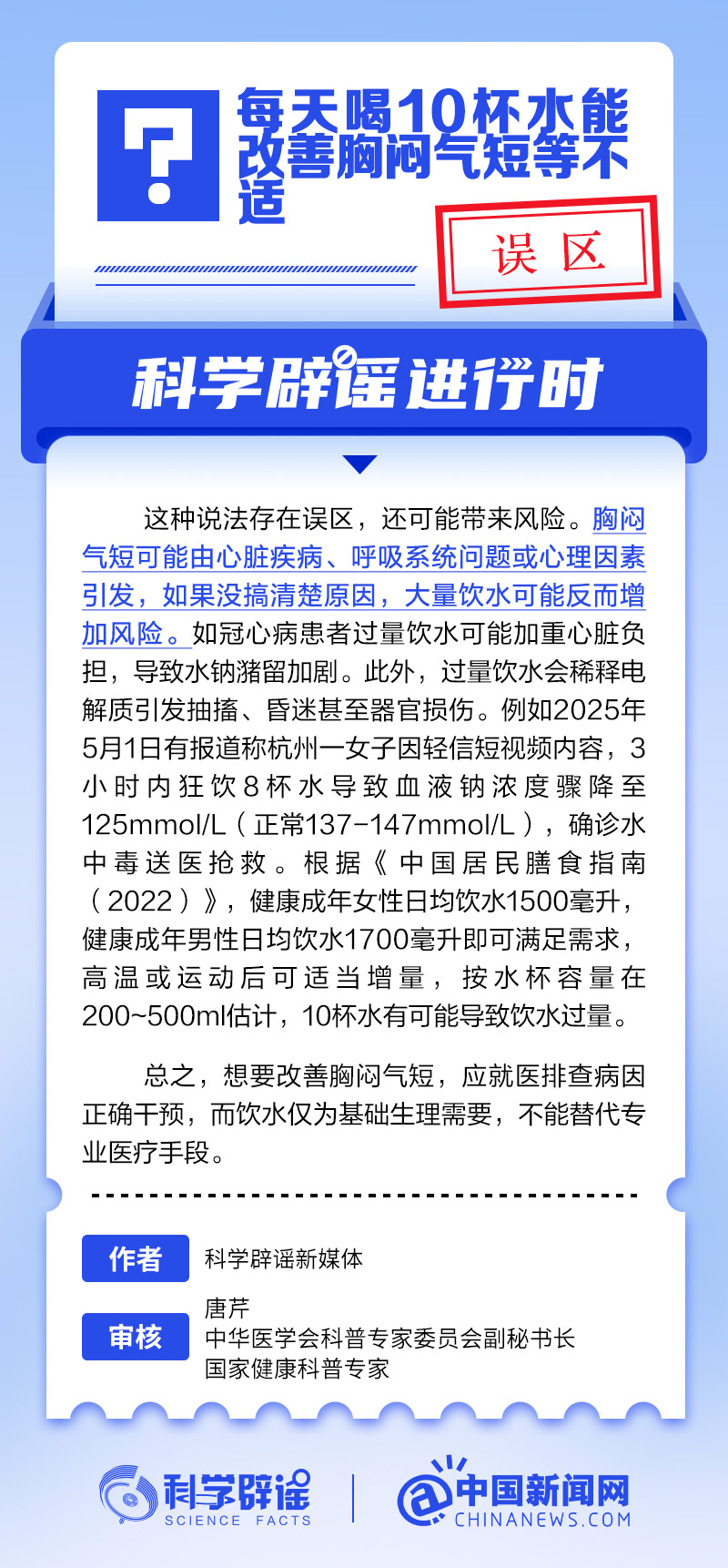 中新网5月23日电 胸闷气短可能由心脏疾病、呼吸系统问题或心理因素引发,如果没搞清楚原因就大量饮水,可能增加风险。如冠心病患者过量饮水可能加重心脏负担,导致水钠潴留加剧。过量饮水还会稀释电解质,可能引发抽搐、昏迷甚至器官损伤。(来源:@科学辟谣 中国新闻网微博)