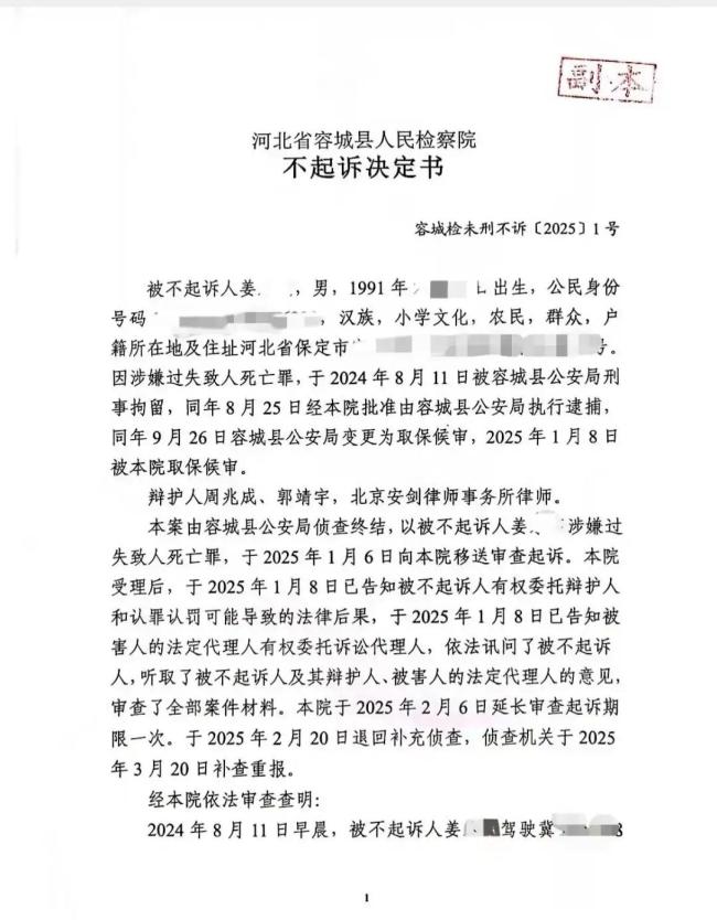 姜某的小舅子孙先生表示,他们已于近期收到了容城县人民检察院的《不起诉决定书》,最终决定对姜某不起诉。孙先生说,事发后,他们取得了被害人家属的谅解。如今收到《不起诉决定书》,让他们终于松了一口气。由于经济负担重,姜某本人已外出务工,他们希望家中能尽快恢复平静。