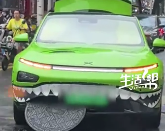 5月22日,湖北武汉,一汽车在暴雨中被翘起的井盖卡到,因车头牙齿装饰太应景,被网友调侃“鲨鱼在吃奥利奥”而走红。车主:正在联系水务公司。