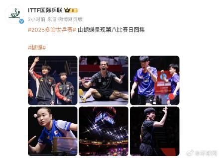 5月25日,ITTF国际乒联发布了2025多哈世乒赛第八比赛日的图集。图集中展示了王楚钦和孙颖莎的合影,以及两人在混双决赛获胜后,王楚钦比出“3”的手势庆祝获得三连冠的照片。今晚,王楚钦和孙颖莎还将参加男女单打决赛,期待他们再次取得佳绩。