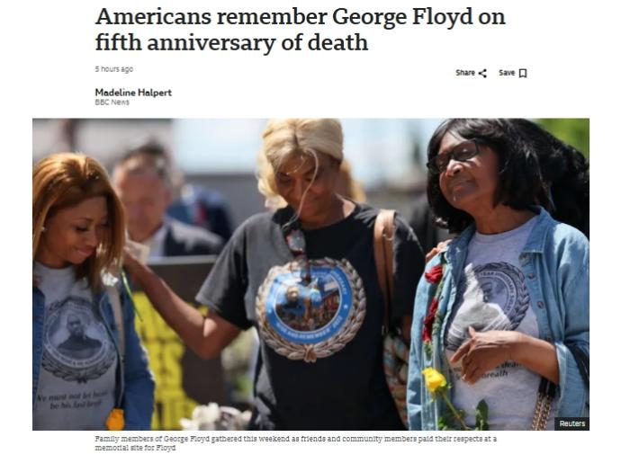 非裔男子弗洛伊德遭白人警察跪压致死五周年 美多地举行悼念活动