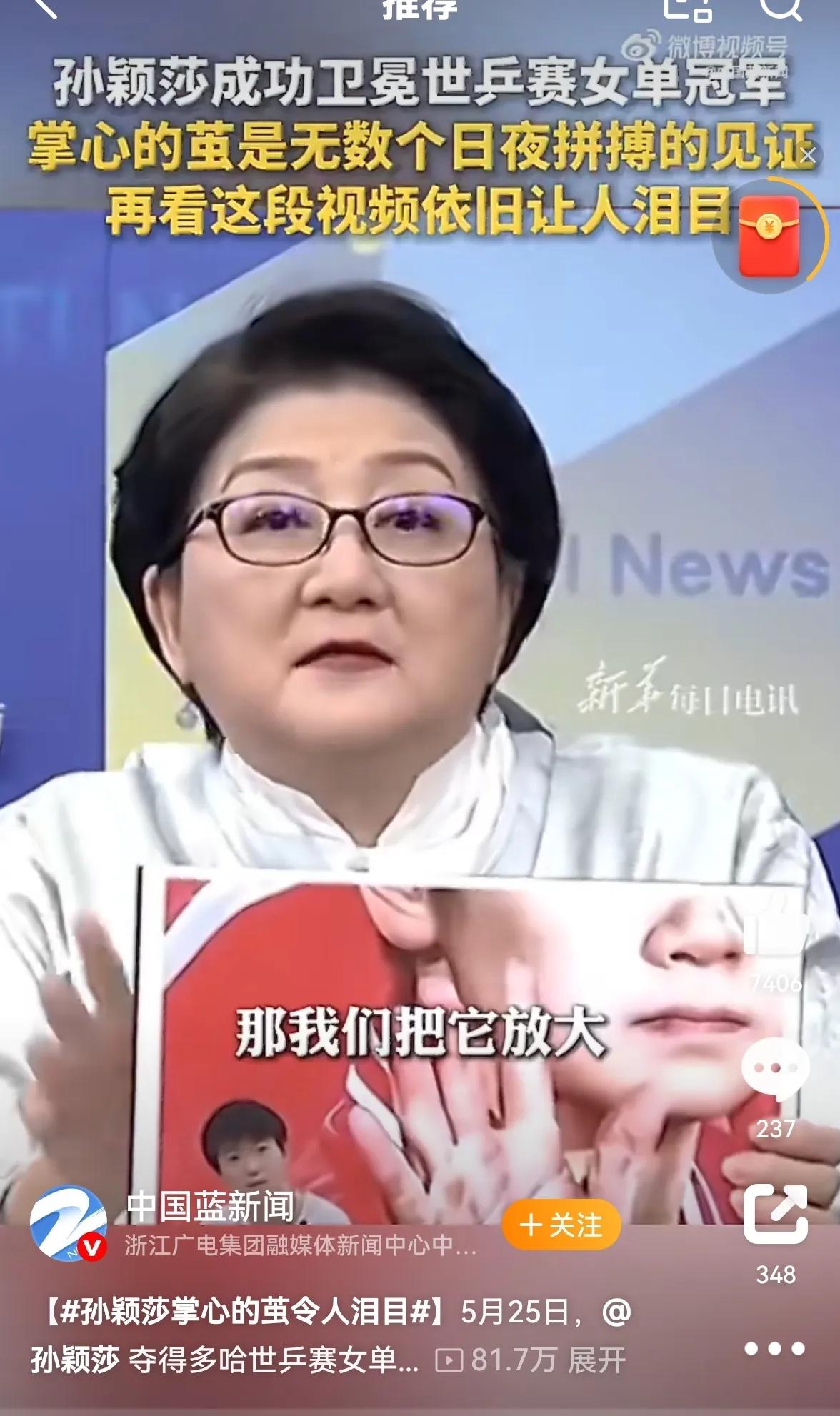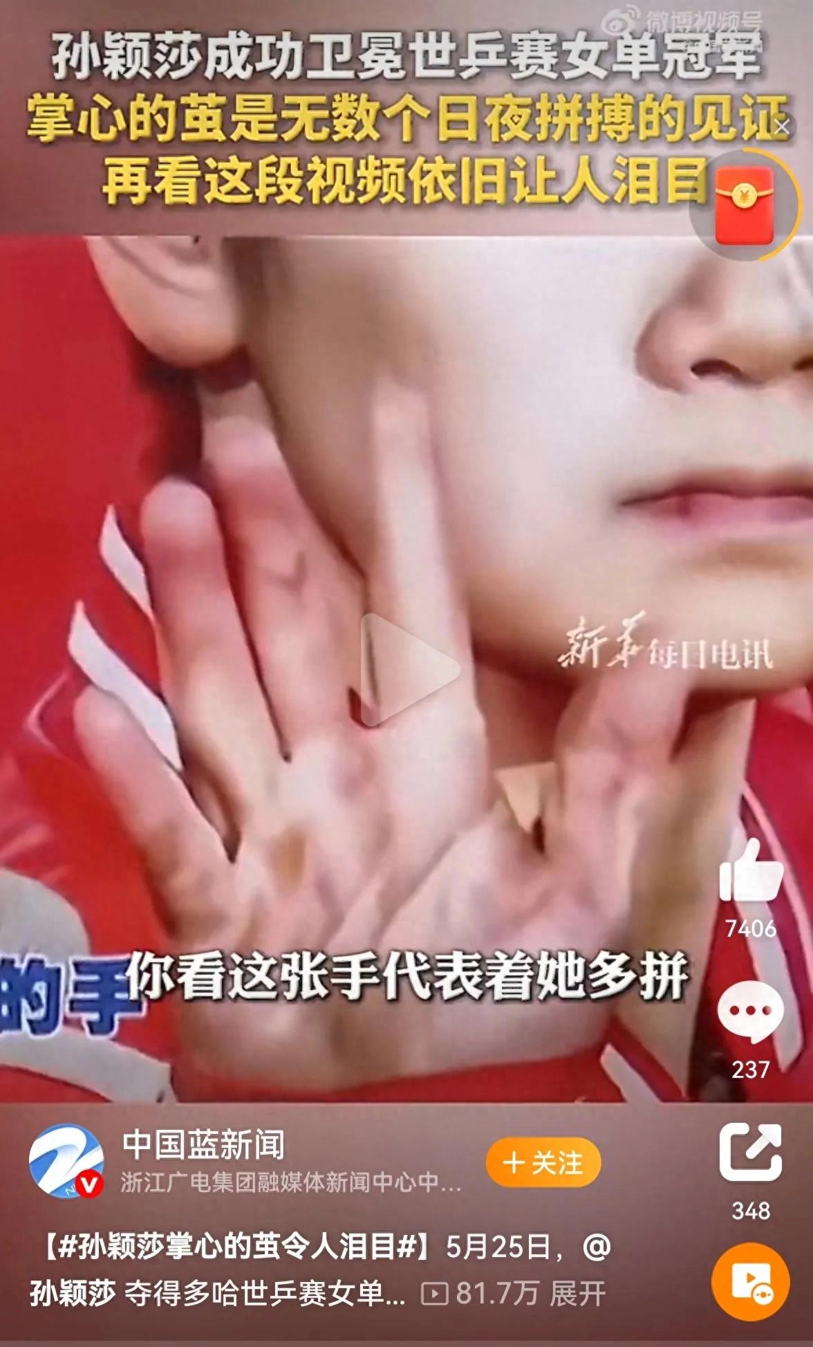 台湾名嘴手持孙颖莎照片哽咽发声。台湾名嘴雷倩在节目中手持孙颖莎一张照片哽咽发声,莎莎手掌心的老茧真的触目惊心。真的是一局一局打出来,平时训练一局一局练出来的。