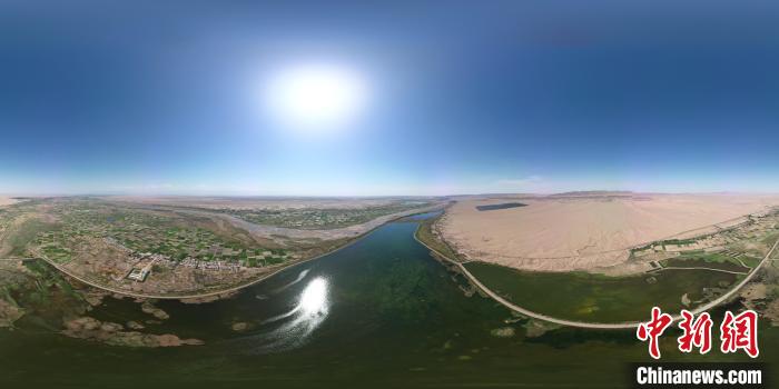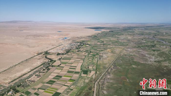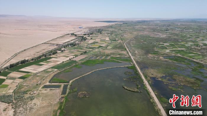 5月27日,位于甘肃张掖市高台县黑河湿地保护区的荒漠与湿地共生共美。该保护区南依祁连山国家级自然保护区,北靠巴丹吉林沙漠,处于河西走廊“蜂腰”地带,是中国西北地区自然保护区网络的重要节点。图为处在荒漠中的湿地保护区。(无人机图片) 戴文昌 摄