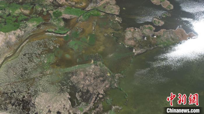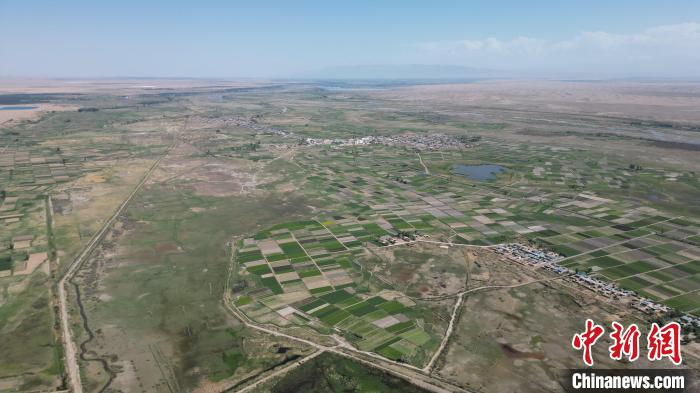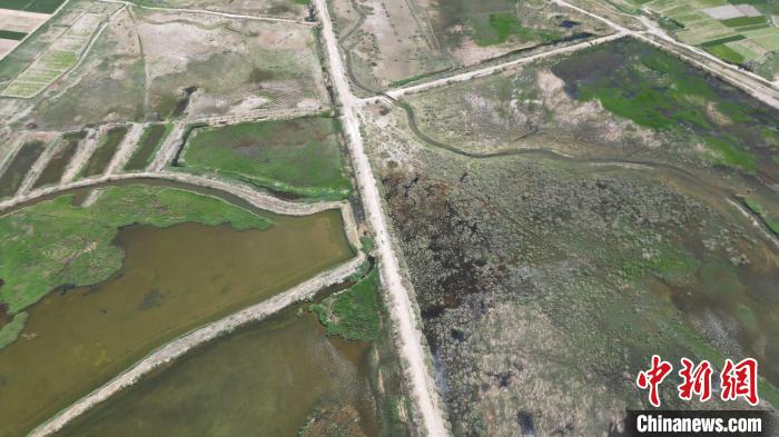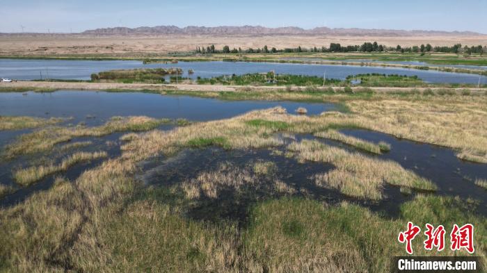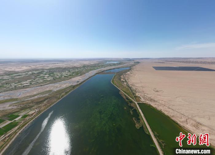 5月27日,位于甘肃张掖市高台县黑河湿地保护区的荒漠与湿地共生共美。该保护区南依祁连山国家级自然保护区,北靠巴丹吉林沙漠,处于河西走廊“蜂腰”地带,是中国西北地区自然保护区网络的重要节点。图为碧波荡漾的湿地保护区。(无人机图片) 戴文昌 摄