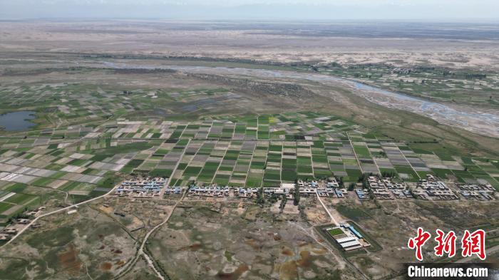 5月27日,位于甘肃张掖市高台县黑河湿地保护区的荒漠与湿地共生共美。该保护区南依祁连山国家级自然保护区,北靠巴丹吉林沙漠,处于河西走廊“蜂腰”地带,是中国西北地区自然保护区网络的重要节点。图为荒漠中的 “绿色珍珠” 。(无人机图片) 戴文昌 摄