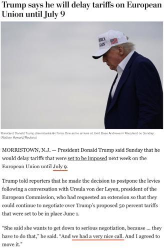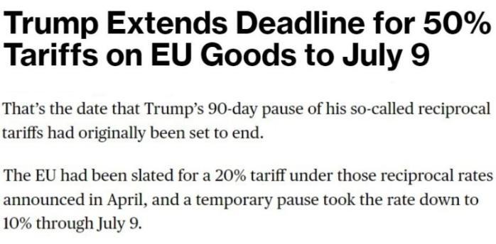 他25日告诉记者,自己当天与欧盟委员会主席冯德莱恩“愉快”地通了电话,并应对方要求,决定将原计划从6月1日开始对欧盟加征的50%的关税推迟到7月9日,以便双方有时间就此进行谈判。