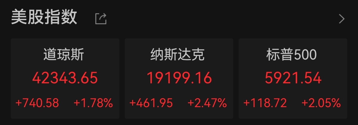 中新经纬5月28日电 美东时间周二,美股三大指数集体上涨。道琼斯工业指数收涨740.58点,涨幅1.78%,报42343.65点。纳斯达克指数收涨461.96点,涨幅2.47%,报19199.16点。标普500指数收涨118.72点,涨幅2.05%,报5921.54点。