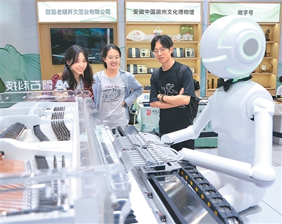 观众在文博会现场围观机器人弹钢琴。