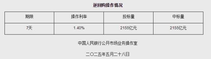 5月28日央行开展2155亿元7天期逆回购操作