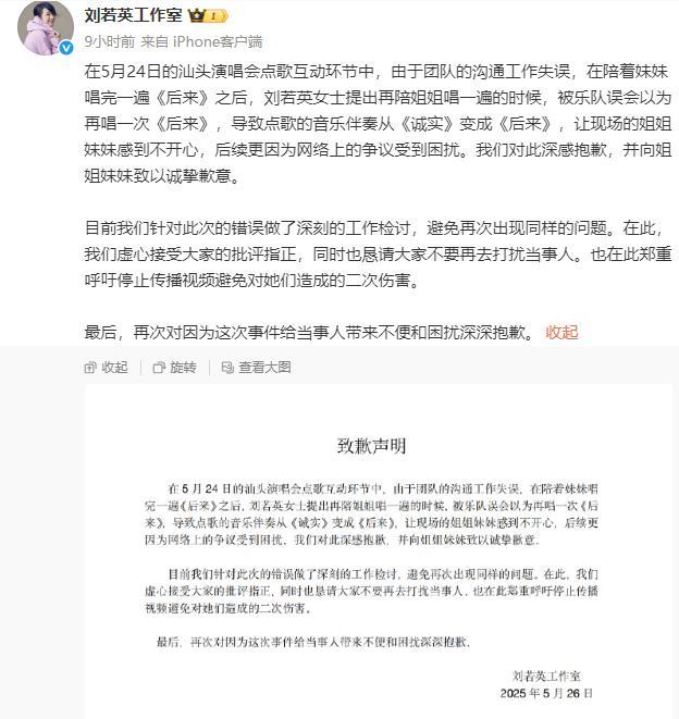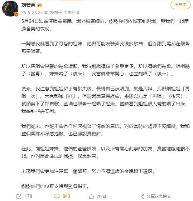 5月26日深夜,刘若英发文道歉回应演唱会两姐妹点歌事件。她解释称,当时是想和姐姐再唱一次,但由于现场沟通误会,乐队以为是“再唱一次”《后来》。刘若英写道:“5月24日汕头演唱会那晚,场外飘着细雨,谢谢你们依然来到现场,与我们一起度过音乐的夜晚。一开场我就看到了可爱的姐妹,她们可能没听过我很多歌曲,但从头到尾都在跟着节奏唱着。”