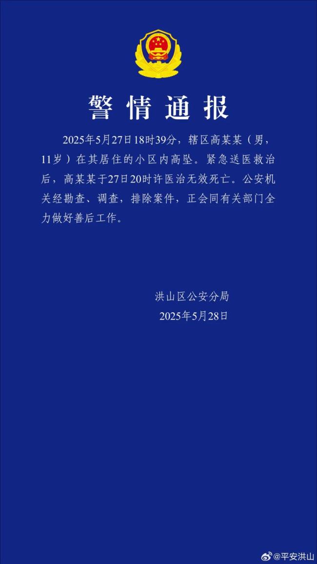 5月28日,武汉市洪山区公安分局发布了一则通报。通报称,5月27日18时39分,一名11岁男孩高某某在其居住的小区内从高处坠落。紧急送医后,高某某于当晚20时左右因伤势过重不幸去世。经过现场勘查和调查,公安机关排除了刑事案件的可能性,目前正在与相关部门全力处理善后事宜。