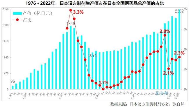 近32年(1991~2022年),汉方制剂产值在日本医药品总产值的占比平均为2.21%,相当于日本医药品总产值的1/45。