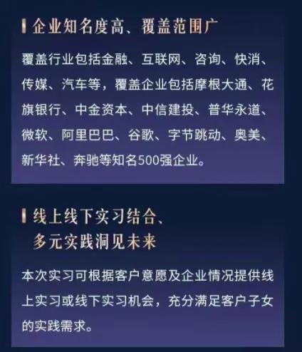 根据宣传内容,兴业银行可以为客户子女提供金融、互联网、咨询、快消、传媒、汽车等行业的实习机会,包括摩根大通、中金资本、谷歌、微软、阿里巴巴、花旗银行、中信建投、字节跳动、普华永道、奔驰等知名500强企业。
