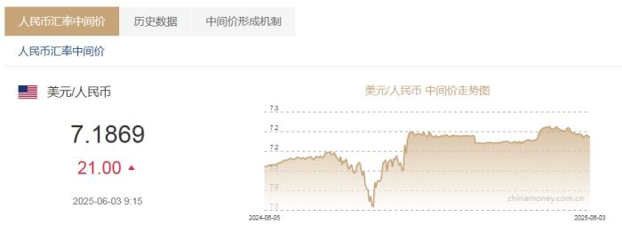 中新网6月3日电 据中国外汇交易中心网站消息,中国人民银行授权中国外汇交易中心公布,2025年6月3日银行间外汇市场人民币汇率中间价为:1美元对人民币7.1869元,下调21个基点。图片来源:中国外汇交易中心网站截图