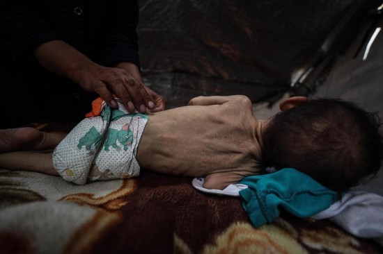 这是5月28日在加沙城西部一处临时安置点拍摄的一名营养不良的婴儿。新华社发(马哈茂德·扎基摄)