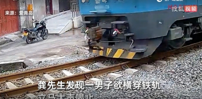 居民喝退横穿铁轨男子火车瞬间驶过。6月3日,重庆,龚先生发现一外地男子欲横穿铁轨,立即大声喝止。该男子后退几步后停止行动,此时火车驶过。居民喝退横穿铁轨男子火车瞬间驶过居民喝退横穿铁轨男子火车瞬间驶过居民喝退横穿铁轨男子火车瞬间驶过
