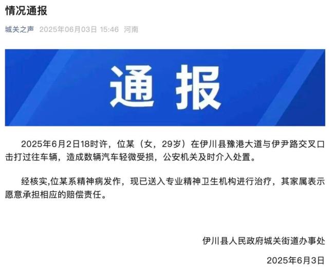 29岁女子当街打砸多辆汽车!今天(3日),“一女子拿铁棍无差别攻击过往车辆、多次跳在车顶上打砸车辆”的视频引发了广泛关注。下午,河南省洛阳市伊川县人民政府城关街道办事处发布了情况通报。