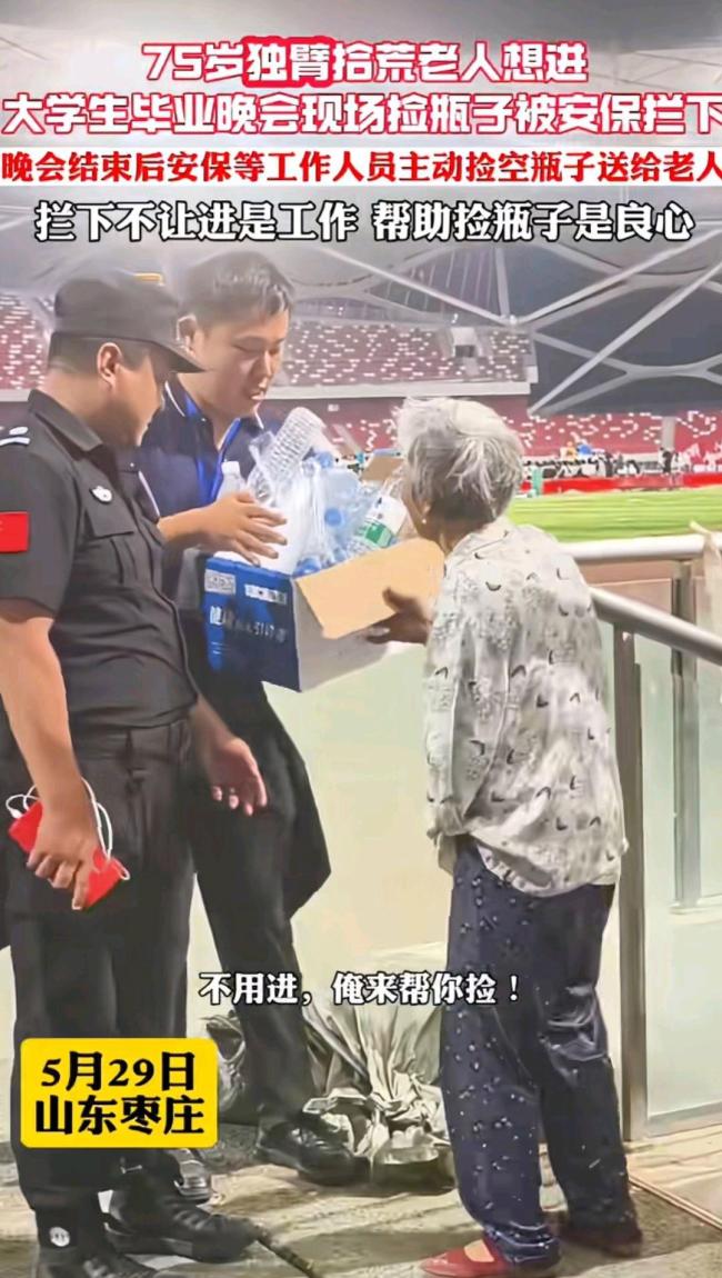 接下来发生的一幕却让人心头一暖。安保人员看着老人真诚地说道:“不用进,俺来帮你捡!”晚会结束后,他们真的没有食言,安保等工作人员纷纷行动起来,在场地里仔细搜寻空瓶子,将它们一一收集起来装到箱子里送到老人面前。有的工作人员还蹲下身陪着老人一起整理瓶子,把瓶子里的水倒掉,把瓶子踩扁,最后还帮忙装袋。老人看着地上一堆堆的空瓶子,满是皱纹的脸上露出了感激的笑容,一句“谢谢你了”简单却饱含着无尽的谢意。
