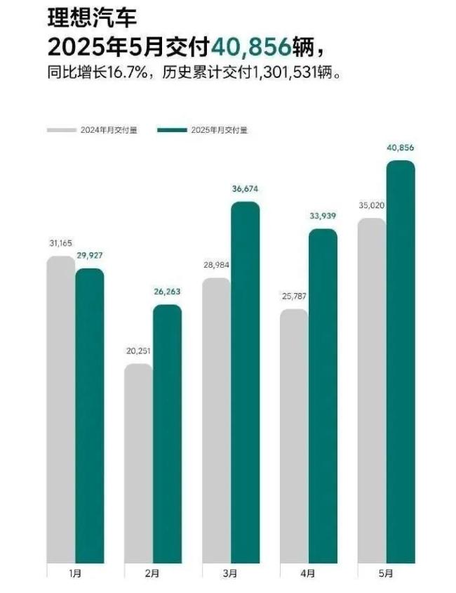 排在第二的是理想,也属于稳定发挥。在5月,理想汽车交付新车40,856辆,同比增长16.7%,环比增长超20%。截至2025年5月31日,理想汽车历史累计交付量为1,301,531辆。过去一个月,理想完成了全系车型的智能焕新版升级,理想官方说预计在7月会回升到月销5万的水平。