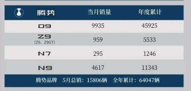 第四是腾势品牌,销量为15,806辆,其中除了稳定共享的D9之外,N9成为了新的销量支柱。就产品来看,D9在5月销量9935辆,N9今年5月销量4617辆,表现不错。其他车辆都是打酱油的角色。其中Z9(Z9、Z9GT)5月销量959辆,N7在5月销量295辆。