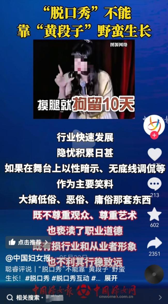 沈阳文旅回应“女演员被摸腿” 未发现违规内容!日前,沈阳波波笑剧场一名男观众当众摸女演员大腿被拘留10天事件引发争议。不少网友认为,涉事观众的行为理应接受法律处罚,但也有人质疑女演员长期以“摸腿梗”作为演出内容,涉嫌违规。《中国妇女报》为此发布评论称,“脱口秀”不能靠“黄段子”野蛮生长。