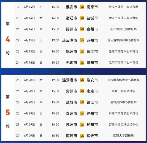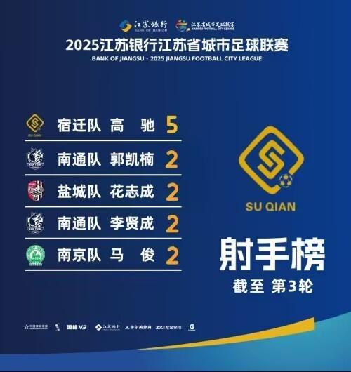 射手榜方面,宿迁队的高驰以5粒进球继续领跑,南通队的郭凯楠、盐城队的花志成、南通队的李贤成以及南京队的马俊各有两球入账。