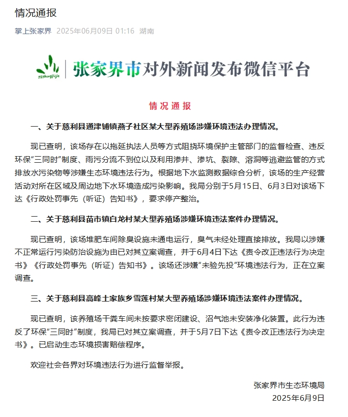 湖南张家界通报慈利县3家大型养殖场涉嫌环境违法情况