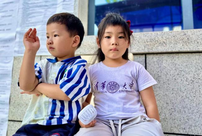 6月7日上午,高考开考10分钟后,在黔东南州凯里市黔东南州民族高级中学考点外,一名约5岁的小女孩身穿“清华T恤”为姐姐加油鼓劲。小女孩是跟着妈妈余女士和弟弟一起来的,他们在考场大门外等候,陪伴姐姐参加高考。小女孩穿的T恤上印着“清华大学”4个字,寄托了家人对姐姐的美好祝愿。