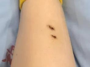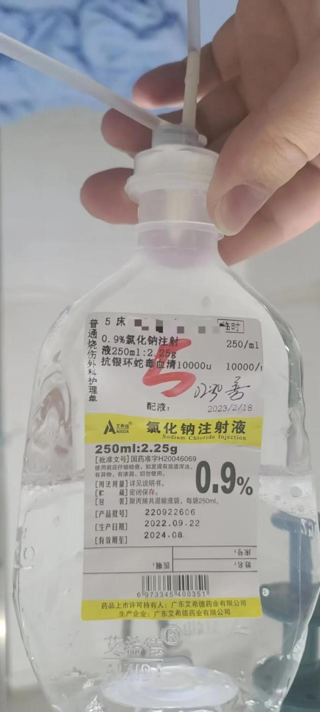 她到医院后,医生取了伤口血液进行检测,并对伤口进行了放血处理。接着医生在伤口外沿十厘米左右的地方围着腿打了一圈阻断药,疼痛让她全身是汗。医生初步判断咬她的可能是银环蛇,所以主要给她注射了银环蛇血清。第一支血清注射到一半时,护士跑进来说“银环蛇毒阳性”,最终她总共注射了16支血清。