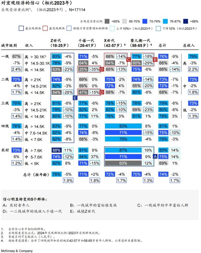 一线城市的高收入X世代(42-57岁),对比2023年乐观比例下降14个百分点;一线城市的富裕银发族(婴儿潮一代,58-65岁),乐观比例也从95%降到了77%,下降18个百分点。