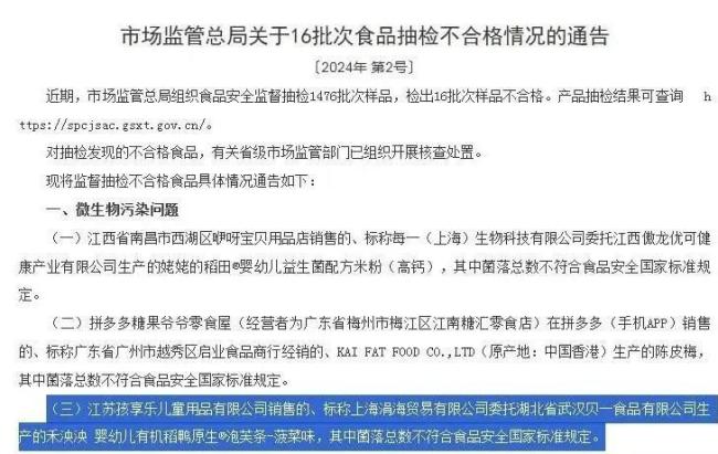 其中,江苏孩享乐儿童用品有限公司销售的、标称上海涓海贸易有限公司委托湖北省武汉贝一食品有限公司生产的禾泱泱婴幼儿有机稻鸭原生泡芙条(菠菜味)菌落总数不符合食品安全国家标准规定。
