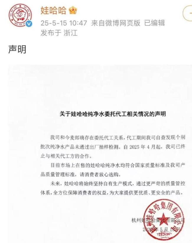 彼时,娃哈哈集团发布声明,承认与今麦郎存在代工关系,但因“个别批次产品未通过出厂检测”,已于今年4月终止合作,并强调在售产品均符合国家标准,未来将坚持自有生产模式。
