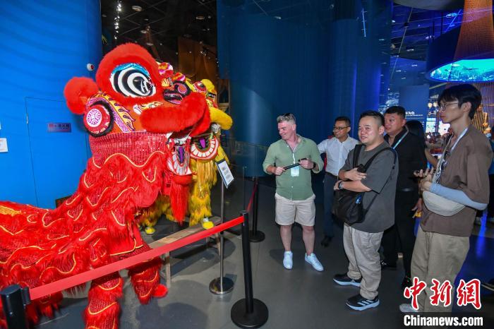 6月8日,海南陵水,海南疍家博物馆展出的舞狮场景吸引中外游客。中新社记者 骆云飞 摄