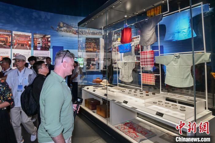 6月8日,海南陵水,海南疍家博物馆展出的疍家人婚庆服饰等,吸引参观者。中新社记者 骆云飞 摄